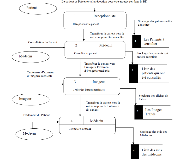 Pour le système de gestion d’imagerie médicale le diagramme de flux de données (DFD) permet de représenter les flux d’informations qui circulent dans le service d’imagerie médicale. Il montre aussi les transformations et les conservations des données effectuées par le système. Il montre également les sources et les destinations des informations.