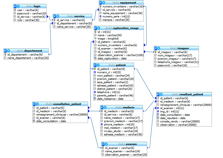 Ce diagramme montre les opérations faites lors de la demande d’examen d’imagerie médicale et le traitement d’imagerie. Le patient doit être consulté par un médecin du CHUK ou avoir un transfert d’un autre hôpital pour la demande d’examen d’imagerie médicale le médecin grâce à le diagnostic du patient est le seul qui autorise le patient a passe a la demande d’examen d’imagerie médicale ou pas.