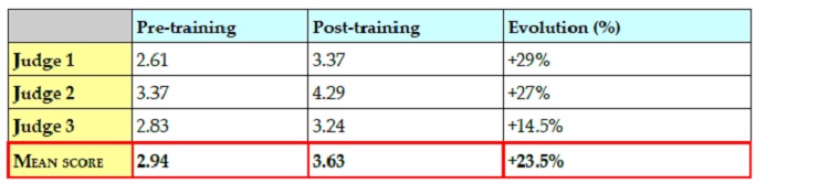 global score of the group has increased from 2.94 in the pre-training productions to 3.63 in