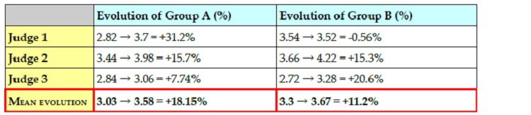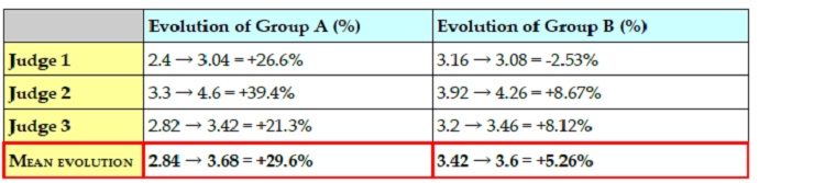 is slightly weaker with Judge 3, i.e. +21.3%, but it is still above Group B, with +8.12%.