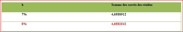 Nous remarquons que la somme des carrés des résidus au taux de 8% est plus petite que celle au taux de 7%. Autrement dit, le taux d’inflation de 8% est d’un point de vue statistique est celui qui minimise les erreurs lors de la tendance moyenne (estimation) de notre échantillon.