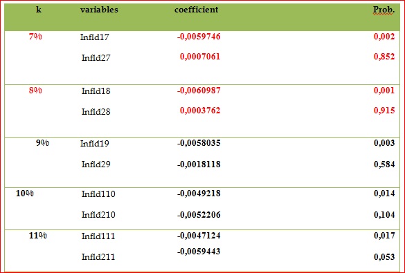 Au regard de ces estimations, nous constatons qu’au-delà des taux de 7% et de 8% l’inflation influence négativement le taux de croissance économique mais a un effet non significatif en dessous de ceux-ci (Voir tableau ci-dessus). A 9%, 10% et 11%, l’effet négatif du taux d’inflation sur le taux de croissance économique apparaît tant en dessous qu’au-delà.