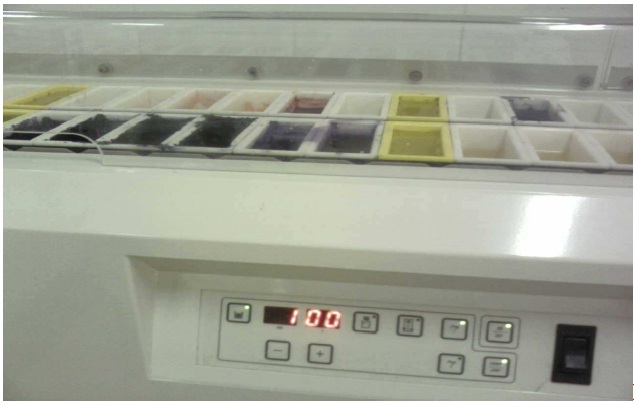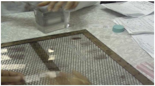 – Après coloration par l’appareil (Voir photo 04), on sèche les lames avec des compresses stériles, puis,