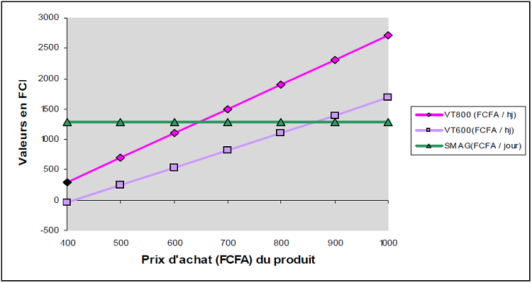 La figure 6 illustre la valorisation de la journée de travail (VT) comparée au salaire minimum agricole garanti (SMAG) journalier du pays suivant l’évolution du prix aux producteurs. Pour un prix au producteur inférieur ou égal à 400 FCFA, VT600 est négative, ce qui signifie que l’allocation du facteur travail à la culture de café dans ces conditions n’a pas été, non seulement rentable mais constitue également une perte pour le producteur. La VT600 est inférieur au SMAG pour un prix au producteur inférieur à 860 FCFA et devient supérieur au SMAG lorsque le prix au producteur est supérieur 860 FCFA. De cette remarque, il ressort que pour un rendement de 600 kg / ha, la culture de café ne devienne compétitive que lorsque le prix d’achat du produit café se situe au-delà de 860 FCFA autrement dit si la marge brute est supérieur à 265 840 FCFA. Pour ce qui est du cas de VT800, elle devient nettement supérieure au SMAG contrairement à VT600, déjà à partir du prix au producteur égal à 650 FCFA, soit à partir d’une marge brute égale à 259 160 FCFA. Ce qui suppose qu’à part le prix d’achat, le rendement joue énormément sur la rentabilité d’une culture. Ainsi en comparant VT600 et VT800 pour un même niveau de prix aux producteurs, il apparaît plus avantageux pour les caféiculteurs de chercher à augmenter leurs marges brutes en agissant sur le rendement que de s’attendre à un prix d’achat très élevé.