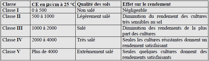 La conductivité électrique des sols détermine leur degré de salinité. Cette salinité se traduit par un comportement différent des cultures vis-à-vis des classes de salinité. L’échelle de Durand J.H. (tableau 23) a été utilisée pour indiquer la classe de salinité des sols sur extrait 1/5 et l’effet sur le rendement des cultures.