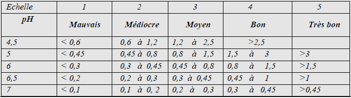 Ainsi la fertilité des sols en azote peut être déterminée à partir d’un abaque proposé par Dabin B. (tableau 25 ci-dessous) qui est fonction de la teneur en azote total et du pH qui propose 5 échelles de fertilité (1 à 5).
