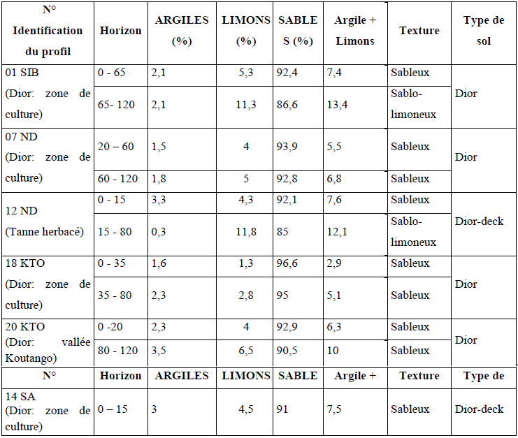 Le tableau suivant montre les résultats de l’analyse granulométrique. Il donne les argiles limons et sables des différents profils de sols étudiés.