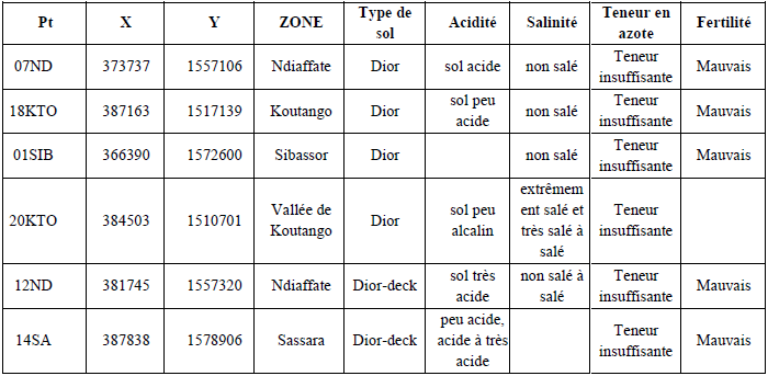 A partir des analyses réalisées sur les échantillons de sol, les paramètres tels que la granulométrie, le pH, la Conductivité électrique, le Carbone ainsi que l’Azote des sols ont été déterminés (Tableaux 21 à 26 et annexe 1).
