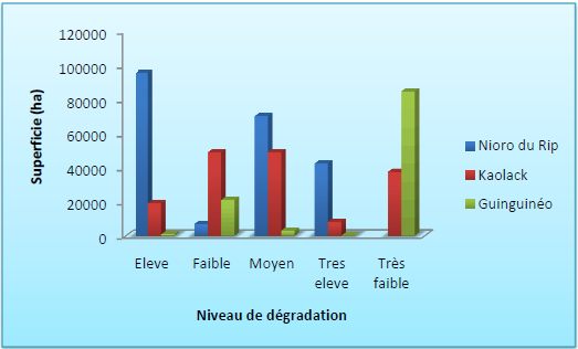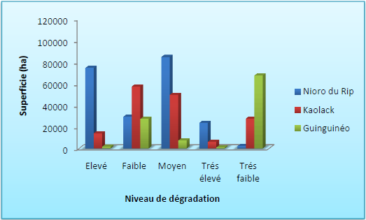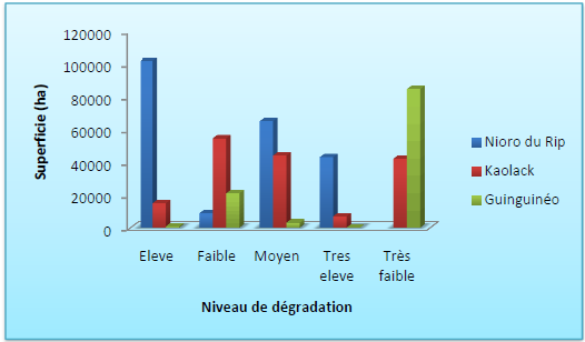 augmentation du niveau de dégradation, élevé (35%) et très élevé (11%). Il est suivi du département de Kaolack (avec respectivement 32%, 9% et 4%) et enfin le département de Guinguinéo (7%, 1% et 1%).