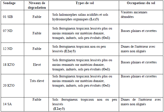 Les niveaux de dégradation trouvés sur la base des informations extraites des images sont en conformité avec des résultats des sondages à l’exception de celui de 07ND situé dans la zone de Ndiaffate. Dans cette zone, où se trouve un type de sol Oe1, nous avons trouvé un niveau de dégradation faible. On peut penser que ce sont les nombreuses interventions en matière de récupération des terres salées qui freinent l’intensité de la dégradation.
