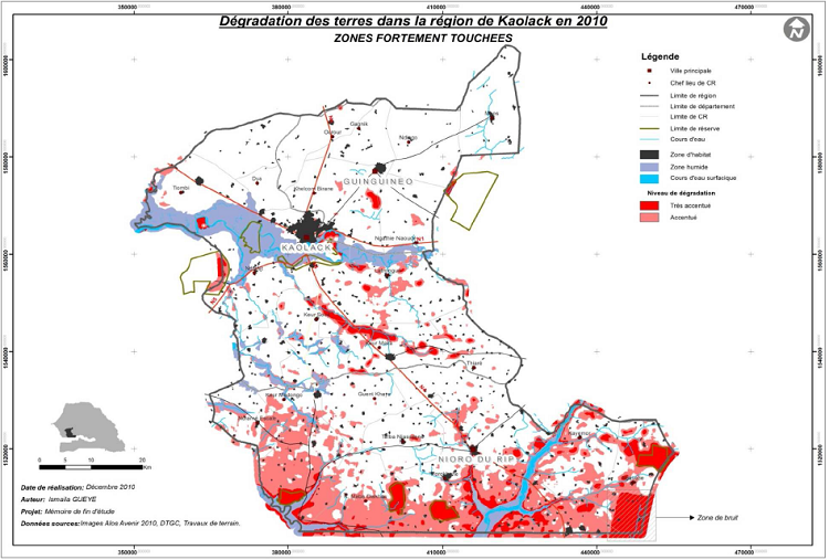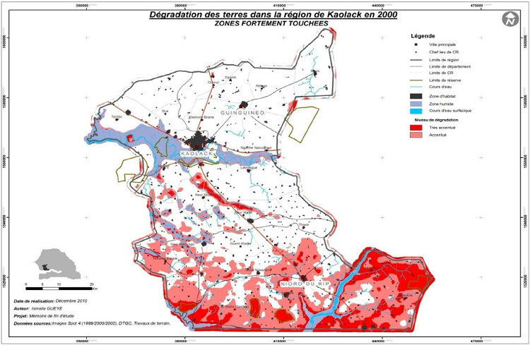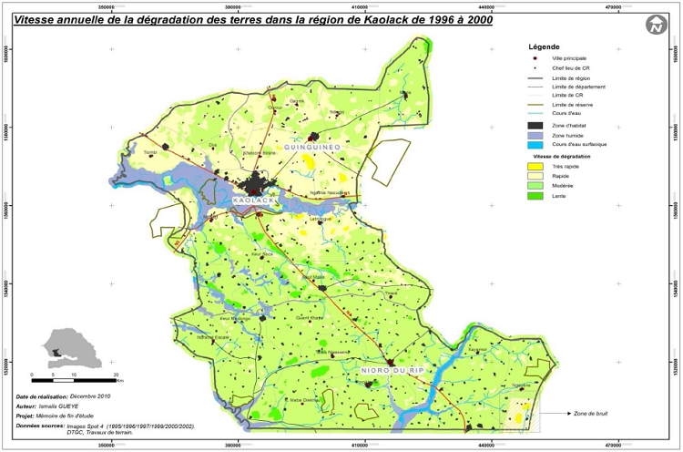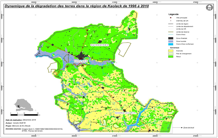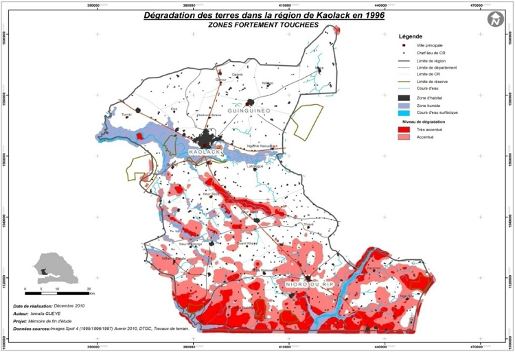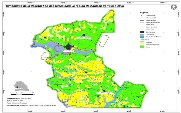 De 1996 2010, la dégradation a connu deux tendances : recul sur presque la moitié nord de la région (principalement sur tout le département de Guinguinéo et à quelques endroits dans les départements de Kaolack et du Nioro du Rip) et avancée sur l’autre moitié sud.