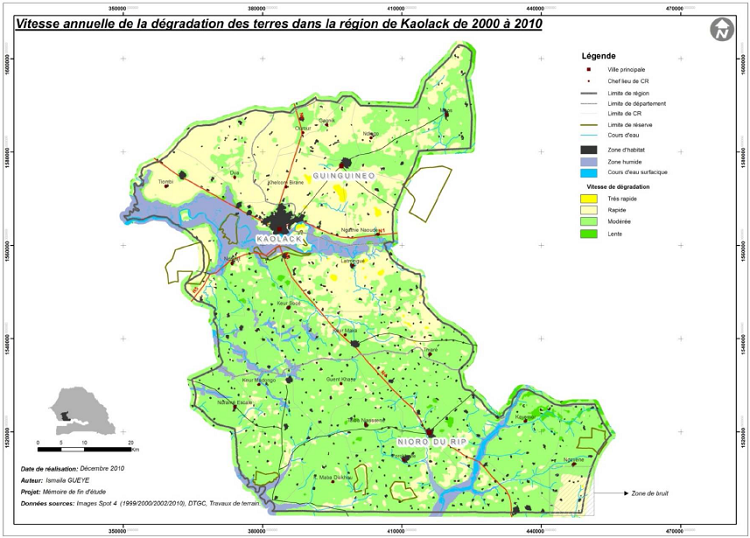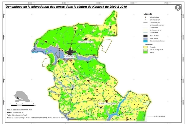 De 2000 à 2010, il y a eu un recul de la dégradation dans presque toute la partie nord est du département de Kaolack et sur presque tout le département de Guinguinéo. De petites parties étaient aussi concernées par ce recul dans le département de Nioro notamment au Centre et à l’Ouest. Les zones « sans changement » c’est-à-dire n’ayant pas évolué étaient peu importantes.