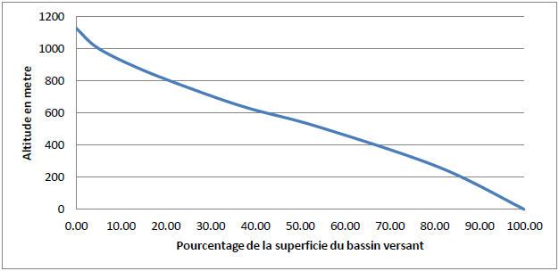 L’étude statistique permet de tracer la courbe hypsométrique. Cette courbe donne la surface en pourcentage où les altitudes sont supérieures à une cote donnée. La courbe hypsométrique (voir figure 4-4) tracée dans le cas de notre étude révèle que 50 % de la surface du BV ont une altitude inférieure à 600 m.