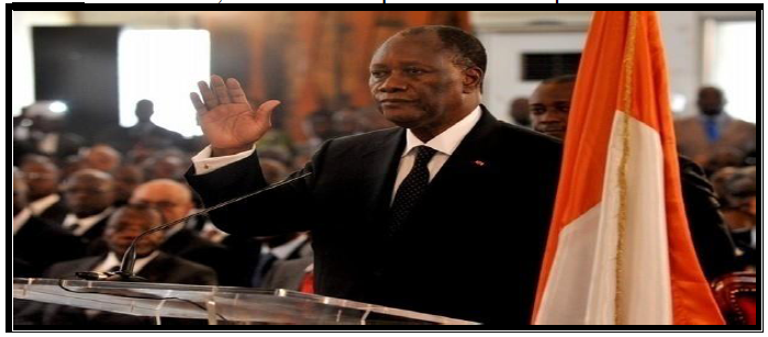 Abidjan le 04 mai 2011, le Président élu Alassane Ouattara, après cinq mois de crise postélectorale qui s‘est muée en belligérance militaire, a prêté serment devant le Conseil constitutionnel(218). Et ce, 72 heures après avoir été proclamé vainqueur par cette institution, dirigée par le Pr Yao Paul N‘Dré, qui avait investi en décembre 2010 son adversaire du second tour du scrutin présidentiel, en l‘occurrence, Laurent Gbagbo.