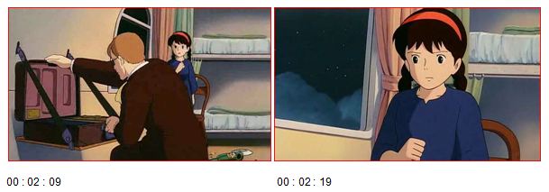 Muska, l’homme en charge de son enlèvement, entre dans la pièce où elle se trouve, les bombardements résonnant au loin. Il lui ordonne : « ne reste pas là, à terre». Dans un premier plan séquence, nous voyons Muska au premier plan, se diriger vers la radio. En arrière-plan, Sheeta est obéissante, effrayée, dos au mur, la main sur la poitrine. Puis un gros plan sur le visage de Sheeta, montre son expression en train de changer. Elle surmonte alors sa peur, saisit une bouteille, et assomme le ravisseur, devenant ainsi une véritable « héroïne miyazakienne » : forte, courageuse.