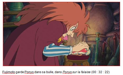 Le père de Ponyo ne veut pas son mal, il croit la protéger, mais la maintient prisonnière. Dans l’une des scènes, où il vient de récupérer Ponyo après sa première fuite, il l’emprisonne dans une bulle afin d’être sûr qu’elle ne s’échappe pas. Cette métaphore n’est d’aillerus pas anodine : il la garde « dans sa bulle », protégée du monde extérieur qui peut faire mal, mais que Ponyo souhaite découvrir. Son combat est celui de toute jeune fille, jeune femme, qui souhaite s’affranchir de son père pour vivre sa vie ; lequel a du mal à s’en séparer.