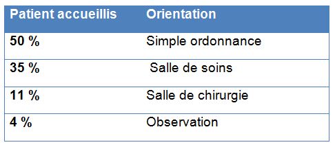 Parmi les patients accueillis de 8 heure à midi on constate que la première cause décelée de cette surcharge est la présence des cas non urgents, car il a été recensé en moyenne parmi les patients accueillis 50% qui non reçu qu’une simple ordonnance puis sont revenu à leurs domiciles.