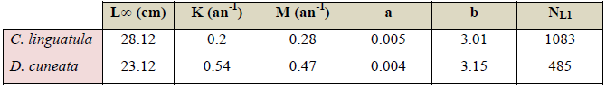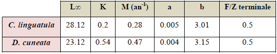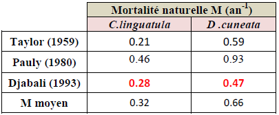 L’estimation de la mortalité (M) pour C. linguatula a aboutit à des résultats allant de 0.21 à 0.46 an-1 avec une valeur moyenne de 0.32 an-1, et de 0.47 à 0.93 an-1 avec une moyenne de 0.66 pour D. cuneata.