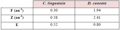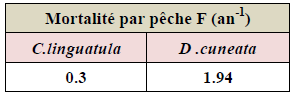 Tableau 19 : Estimation de taux d’exploitation (E) de C. linguatula et D. cuneata