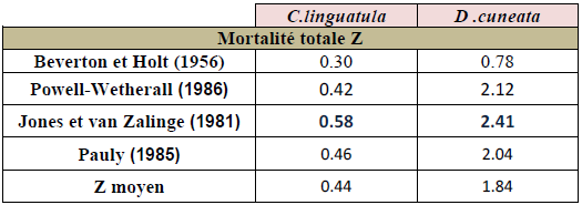 Pour les deux espèces C. linguatula et D. cuneata les résultats estimés directement par la méthode habituelle (Z-M) sont retenus.