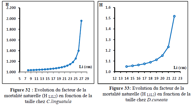 L’analyse des figures 32 et 33 montrent que le coefficient de mortalité naturelle (H L1L2) augmente avec la taille.