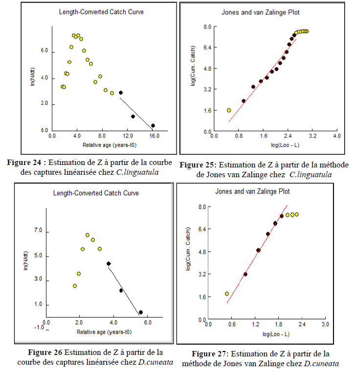 Le coefficient de mortalité totale (Z) varie entre 0.3 et 0.58 an-1 avec une valeur moyenne égale à 0.44 pour C. linguatula. Chez D. cuneata Z varie de 0.78 à 2.41 an-1 avec une valeur moyenne égale à 1.84.Les valeurs retenues sont celles de la méthode de Jones et Van Zalinge (1981) pour les deux espèces afin d’entamer l’étude de l’exploitation.
