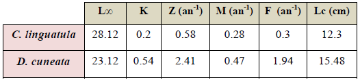 Les valeurs du taux d’exploitation indiquent un état de surexploitation pour D. cuneata, alors que pour C. linguatula cette valeur reflète une situation d’exploitation équilibrée de sa pêche, diagnostic à compléter par l’utilisation des modèles d’exploitation.