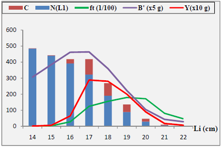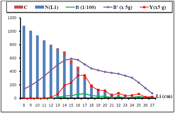 – La biomasse moyenne (B) du stock augmente jusqu’à atteindre une valeur maximale ≈ 2958 Kg correspondant à la taille 15 cm, pour C. linguatula, et de 2318 Kg à une taille de 17 cm pour D. cuneata, puis diminue graduellement avec la taille.