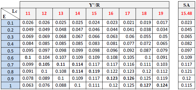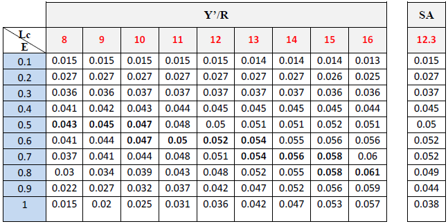 Tableau 23 : Rendement relatif par recrue en fonction de E et pour différentes valeurs de Lc pour D.cuneata