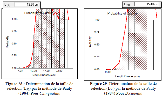 Les figures 28 et 29, représentant les variations de la probabilité (P) en fonction des centres de classe de tailles (Li), permettent d’estimer graphiquement la taille de sélection Lc, correspondant à l’abscisse au point d’ordonnée 50%. La taille moyenne de première capture déterminée ainsi est de 12.30cm pour C. linguatula pour des longueurs extrêmes allant de 8 à 27cm, elle est relative à un groupe d’âge moyen de première capture égale à 2.02 ans environ, chez D. cuneata, la taille de sélection est de 15.48cm à un âge de 1.56 ans.