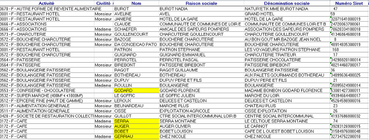 Voici un exemple de fichier client. Il ne contient pas toutes les rubriques (il y une soixantaine de rubriques). Elles ont été volontairement dissimulées. Les établissements en cessation apparaissent toujours.