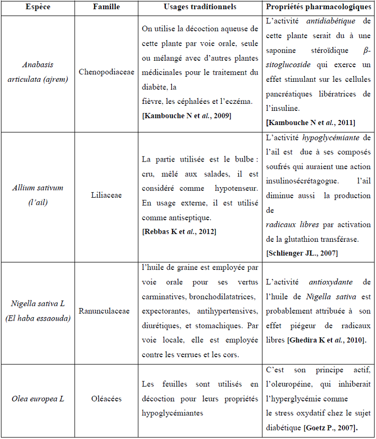 Le tableau IV regroupe quelques exemples de plantes doués de propriétés hypoglycémiantes et/ou antioxydantes utilisés en médecine traditionnelle :