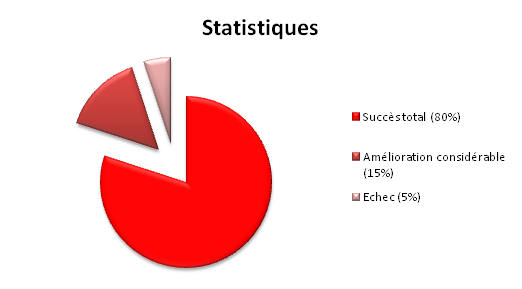 Pour traiter l’hyperhidrose, la sympathectomie thoracique a une efficacité de 97%. Pour l’éreutophobie, le graphique montre bien que dans 80% des cas, l’opération est une réussite : plus aucune rougeur et que dans 15% des cas, les rougeurs sont atténuées alors que dans 5% des cas, l’opération est malheureusement un échec. Même dans les cas de réussite, les sensations de chaleur persistent dans environ 50% des cas. Cela peut apporter à l’éreutophobe une certaine confusion car il croit alors que l’opération est un échec puisqu’il sent ses joues chauffer mais en réalité, il n’en est rien. Pour ce qui est du résultat à long terme, dans 2.5% des cas, des échappements de rougeur surviendraient, ce serait alors la cause d’une technique d’opération inadéquate et mal réalisée avec un simple écrasement de la chaine sympathique. Mais même après une section du nerf, le rougissement peut réapparaître, certes nettement moins prononcé qu’initialement.