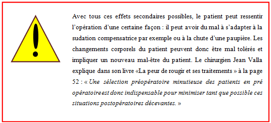 Il peut alors être enlevé de 1 à 3 ganglions. Mais attention, le rougissement se produit des deux côtés du visage, il faut donc que l’intervention soit bilatérale, c’est-à-dire qu’elle soit reproduite des deux côtés. Comme le même nerf responsable du rougissement est aussi celui qui s’occupe de la sudation (transpiration), certains patients craignent qu’ils développent un des effets secondaires redoutés : la sudation compensatoire. On peut dès proposer à ces patients de ne pas sectionner le nerf directement, ce qui serait irréversible, et de poser simplement des « clips » sur la chaine sympathique. Cette dernière méthode est peut être corrigeable mais il y a plus de risque d’échec. Rien n’est donc garanti.