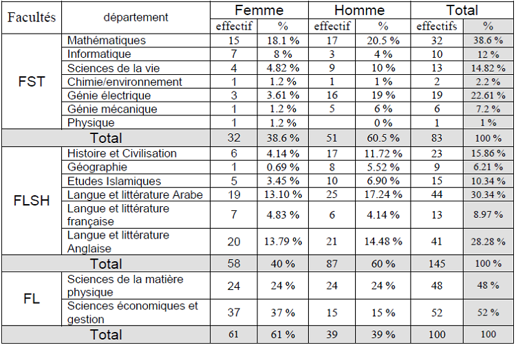 Tel que nous l’avons souligné plus haut, l’effectif des hommes est un peu plus élevé que celui des femmes, et cette configuration se remarque d’autant plus nettement au niveau des différents départements de la FST (60.5 % d’hommes pour à peine 38.6 % de femmes) et la FLSH (60 % d’hommes pour 40 % de femmes) que c’en est l’inverse qui ressort de la répartition au niveau de la faculté polydisciplinaire. En effet, les femmes y sont majoritaires à hauteur de 60 % alors que les hommes n’y représentent que 39%. Il est vrai hommes et femmes sont représentés à parts égales dans le département des Sciences de la Matière Physique, soit une fraction de même ordre d’importance (24 %), toutefois, au niveau du département des Sciences Economiques et Gestion, 3 étudiants sur 5 sont des femmes.