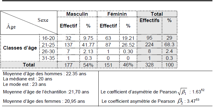 Comme il ressort du tableau ci-dessous, notre échantillon est constitué de 328 individus, les hommes y représentent 54% et les femmes 46%. Autant dire une légère surreprésentation des hommes qui n’est dûe, par ailleurs, qu’aux fluctuations du hasard. La moyenne d’âge s’y situe autour de 21 ans. Cette tendance s’explique par le fait que presque les 3/5 des enquêtés ont moins de 26 ans. En revanche, Même si la majorité des enquêtés, hommes et femmes confondus, est âgée de 21 à 25 ans, la moyenne d’âge par genre accuse une différence assez perceptible : 20.95 ans pour les femmes et 22.35 ans pour les hommes. Nous sommes penchés à mettre ce rajeunissement des femmes, sur le compte de leur percée dont la littérature internationale fait écho. Elles sont comme le disent Latour et La Feuvre (2006, p.162), «[…] moins nombreuses à redoubler pendant leur cursus scolaire et obtiennent un meilleur taux de réussite aux examens »