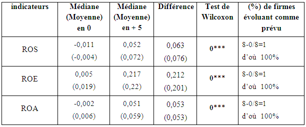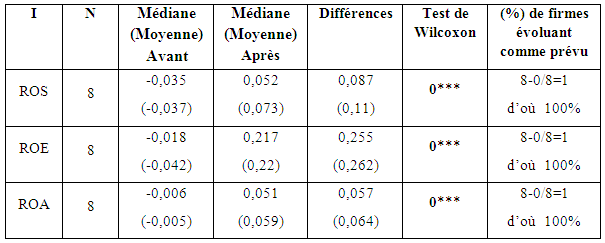 Par exemple, le taux de marge nette (ROS) passe en moyenne de -3,7 % (3 ans avant) à 7,3 % (5 ans après). Les résultats issus du test statistique Z de Wilcoxon (grâce notamment au test de significativité) indiquent que l’augmentation de la performance des (8) huit entreprises privatisées en termes de rentabilité est significative. Enfin, la proportion d’entreprises ayant le signe d’évolution attendu (i.e. amélioration de la rentabilité) est de 100 %.