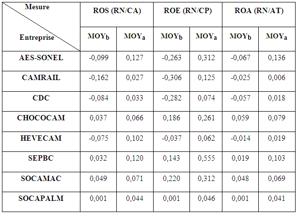 Prenons le cas de la SONEL et de la REGIFERCAM pour essayer de comprendre ces résultats. En effet, pour ce qui est de la SONEL, nous constatons que la moyenne du taux de marge nette est passée de -0,099 (trois années avant la privatisation) à 0,127 (cinq années après la privatisation) ce qui traduit une augmentation des bénéfices réalisés par l’entreprise suite à une augmentation du volume d’activité ; de même nous pouvons noter une amélioration de la rentabilité des capitaux propres (ROE) de -0,263 (trois années avant la privatisation) à 0,312 (cinq années après la privatisation) traduisant ainsi une incidence positive des fonds propres dégagés par les nouveaux actionnaires suite à l’ouverture du capital. On peut aussi remarquer une amélioration de la rentabilité des actifs (ROA) qui est passée de -0,067 (trois années avant la privatisation) à 0,136 (cinq années après la privatisation) traduisant une amélioration significative de l’ensemble des actifs utilisés par la SONEL après sa privatisation. Cette amélioration de la rentabilité de l’entreprise n’est que la résultante d’un ensemble d’aménagements effectués au sein de la société lors de sa privatisation.