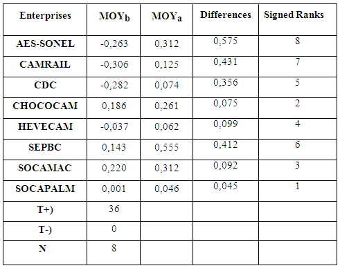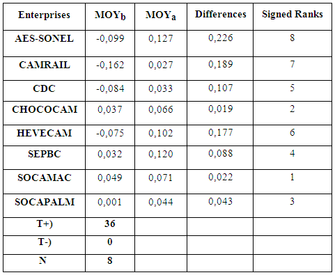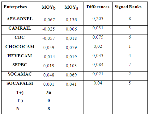 Pour les huit entreprises concernées par le calcul de cet indicateur, toutes ont des rangs positifs. La somme de ces rangs nous donne 36 (8+7+5+2+6+4+1+3) soit T+) du TABLEAU 7 ; les rangs négatifs quant à eux donnent une somme de 0 soit T-) du même tableau. Pour prendre une décision, nous retenons la valeur de T la plus petite soit T= 0.