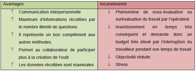 L’entretien ou interview est un processus de collecte d’informations impliquant plusieurs personnes L’opérateur et son supérieur hiérarchique. L’entretien porte sur ce qui est réellement effectué par le travailleur et permet de comprendre le travail en détail et ses conditions.