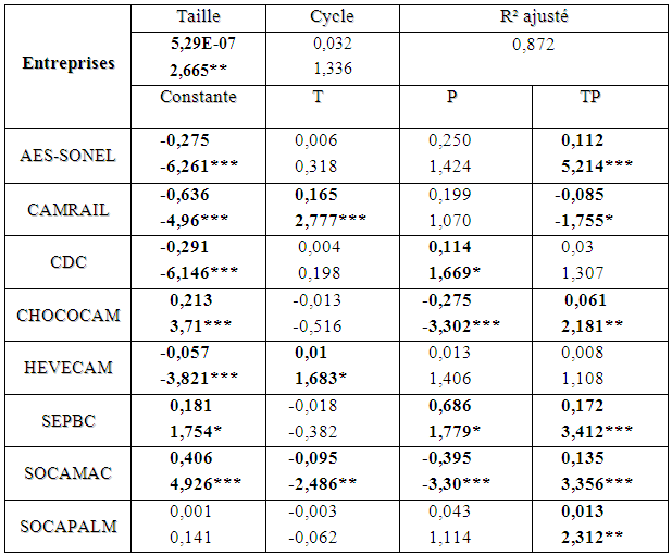 L’évaluation du coefficient de P ne permet toutefois que de cerner les effets de seuil, statiques, de la privatisation. Pour évaluer l’efficacité dynamique, c’est-à-dire l’évolution de la rentabilité après la privatisation, il faut considérer les coefficients de la variable (TP). Ces coefficients sont positifs et significatifs pour cinq (5) entreprises (AES-SONEL, CHOCOCAM, SEPBC, SOCAMAC et SOCAPALM) ; inversement, le coefficient de la variable TP est négatif et significatif pour une (1) seule entreprise (CAMRAIL).