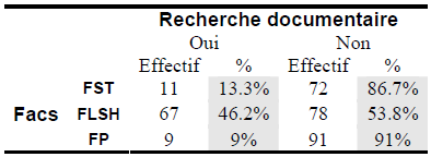 La formation des étudiants, ou du moins leur initiation à la recherche documentaire, semble être le parent pauvre de la formation universitaire. Un peu plus de 90 % des étudiants de la FP déclarent n’avoir jamais bénéficié d’une telle formation. Le même son de cloche est enregistré du côté des deux autres facultés (FST : 86.7 % et FLSH : 53.8 %). Le fait est d’autant plus accentué que 6 à 15 travaux académiques annuels, selon 68 % des enquêtés, nécessitent une recherche documentaire (Voir le tableau 5.5 en annexe B). Il nous est par conséquent, d’ores et déjà loisible d’entrevoir que les étudiants « naviguent à l’aveuglette » pour faire leurs travaux académiques et, qu’à terme, le plagiat électronique ne peut, sciemment ou non, qu’être pratiqué.