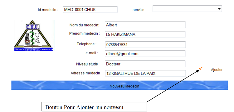 Ce figure nous montre l’enregistrement du médecin âpres la saisie des informations sur le médecin l’utilisateur doit clique sur le bouton ajouter pour l’enregistrement d’un nouveau patient.