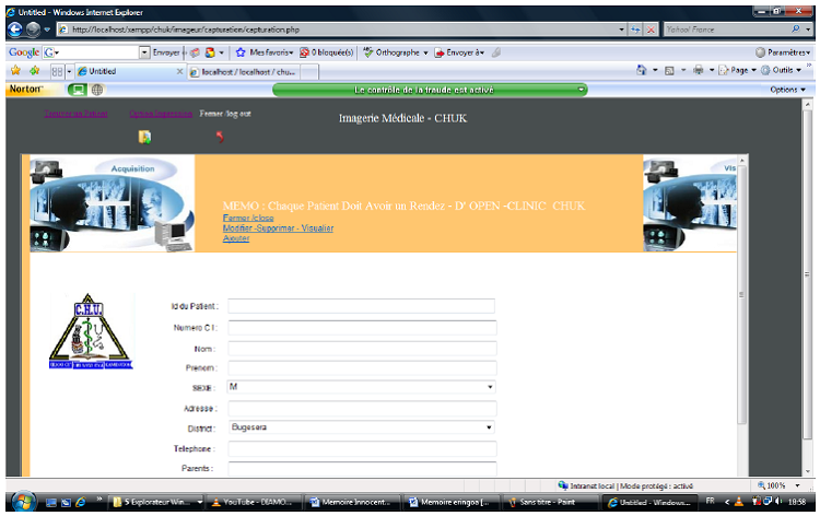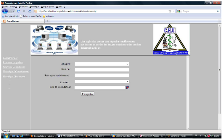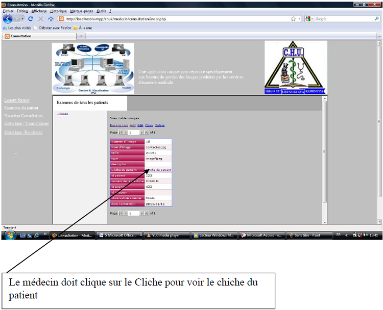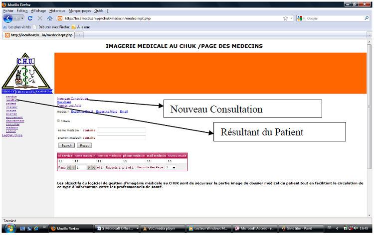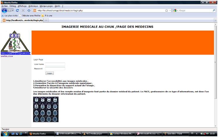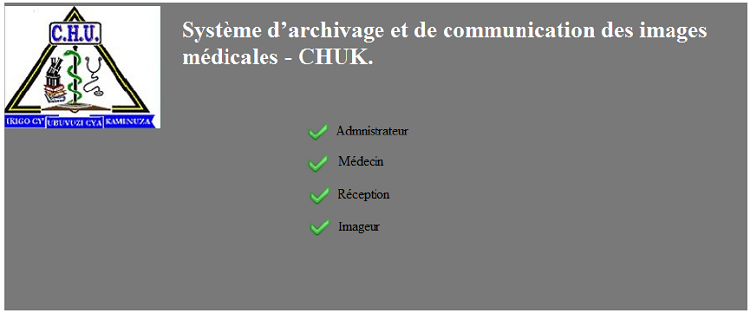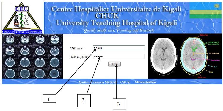 Pour accéder au logiciel de gestion d’imagerie médicale du CHUK , il faut saisir le nom de l’utilisateur et le mot de passe. Si les informations fournies sont correctes, il apparaît un formulaire qui contient les différents menus qui te permettra de faire entrer les données du patient, et faire la saisie de la consultation et traitement du patient de la service d’imagerie médicale au CHUK.