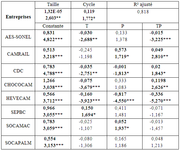 L’effet exercé par le temps (T) sur la productivité est positif et significatif pour une (1) seule entreprise (SEPBC) et négatif et significatif pour quatre (4) entreprises (AES-SONEL, CDC, CHOCOCAM et HEVECAM).
