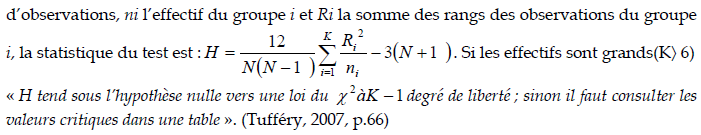 57 Kruskal Wallis test : C’est un test non paramétrique, équivalent à l’ANOVA univariée classique en cas de non normalité de la distribution, utilisé pour déterminer si trois échantillons indépendants et plus viennent de la même population. Les valeurs des échantillons indépendants doivent être sous forme d’échelles ordinales. En fait, il teste l’hypothèse nulle selon laquelle plusieurs population ont la même médiane. (Kazmier, 2004) Il se calcule non en se basant sur les scores mais sur les rangs des scores. Soit N le nombre