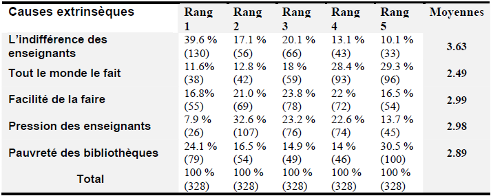 Les causes, Pauvreté des bibliothèques et Tout le monde le fait (perception du comportement des pairs), occupent respectivement les quatrième et cinquième places dans le classement avec des moyennes atteignant 0.89 pour la première et 2.49 pour la dernière.