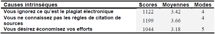 Tableau 5.19 Répartition des causes intrinsèques du plagiat électronique