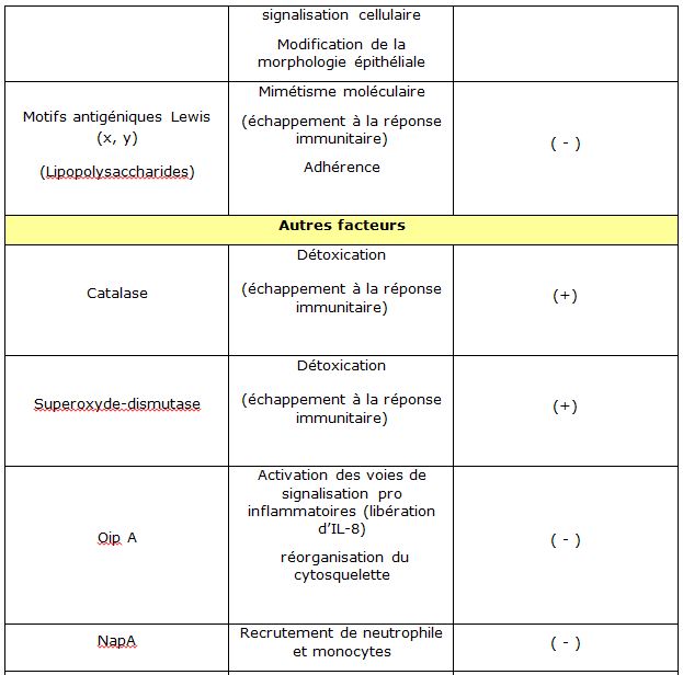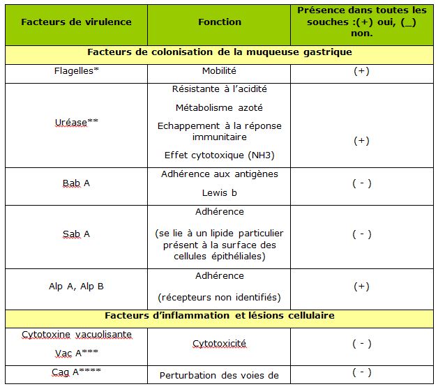 D’autres facteurs sont plus spécifiquement associés à la genèse des lésions et interviennent en altérant l’intégrité de la muqueuse ou en déclenchant, puis modulant la nature de la réaction inflammatoire (facteurs de pathogénicité). La présence ou non des gènes codant ces facteurs, ou leur expression, est une composante variable. (Ferrand, 2009) (Tableau I)