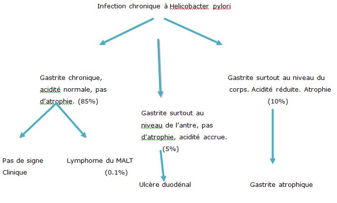 La lésion de base de l’infection à H. pylori est une gastrite, c’est-à-dire une inflammation de la muqueuse gastrique. Elle peut persister des décennies, voire toute la vie du sujet mais n’est pas forcément symptomatique. Par contre, elle peut évoluer vers les maladies suivantes :